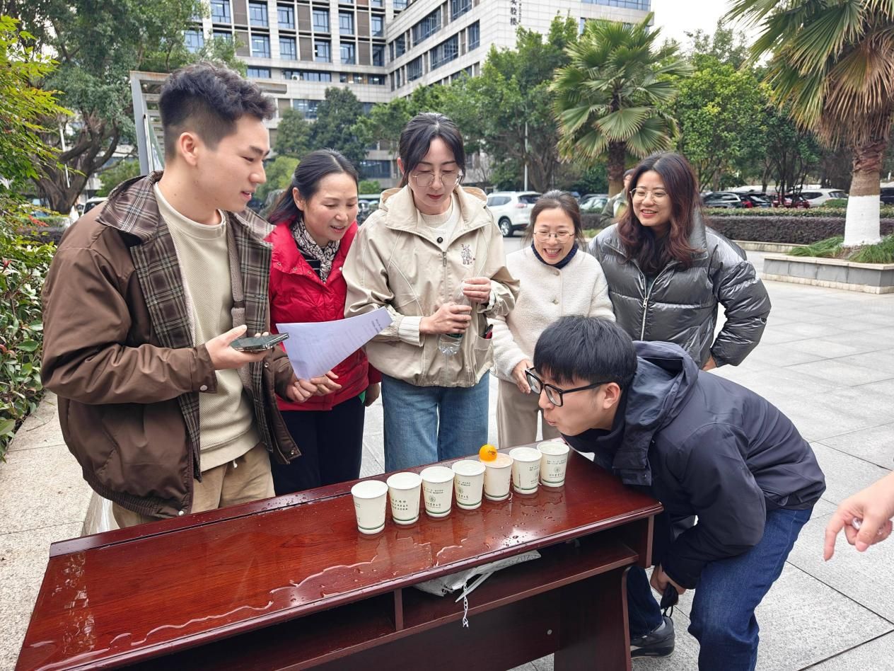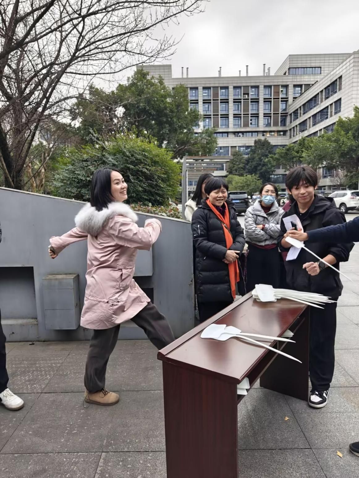 当日下午,五教楼前广场化身欢乐天地,游园活动正式启幕。活动以团队协作闯关形式开展,四大趣味项目各具特色、精彩纷呈。“你来比划我来猜——田园传默契”环节,比划者肢体灵动、巧思迸发,猜题者心领神会、快速应答,无声协作间尽显团队温情,欢声笑语不绝于耳;“摸福字——纳祥迎顺年”项目中,蒙眼教职工在同伴指引下稳步前行,触摸福字的瞬间,既收获了游戏乐趣,更寄托了对新年的美好期许;“保龄球——撞散烦忧迎吉年”现场,大家屏气凝神、精准投掷,圆球击倒水瓶的同时,也释放了一年的疲惫;“水上漂——精准发力向前行”环节则考验耐心与技巧,参赛者小心翼翼吹送乒乓球过水杯,每一次成功都引来阵阵喝彩,团队协作的力量在此充分彰显。