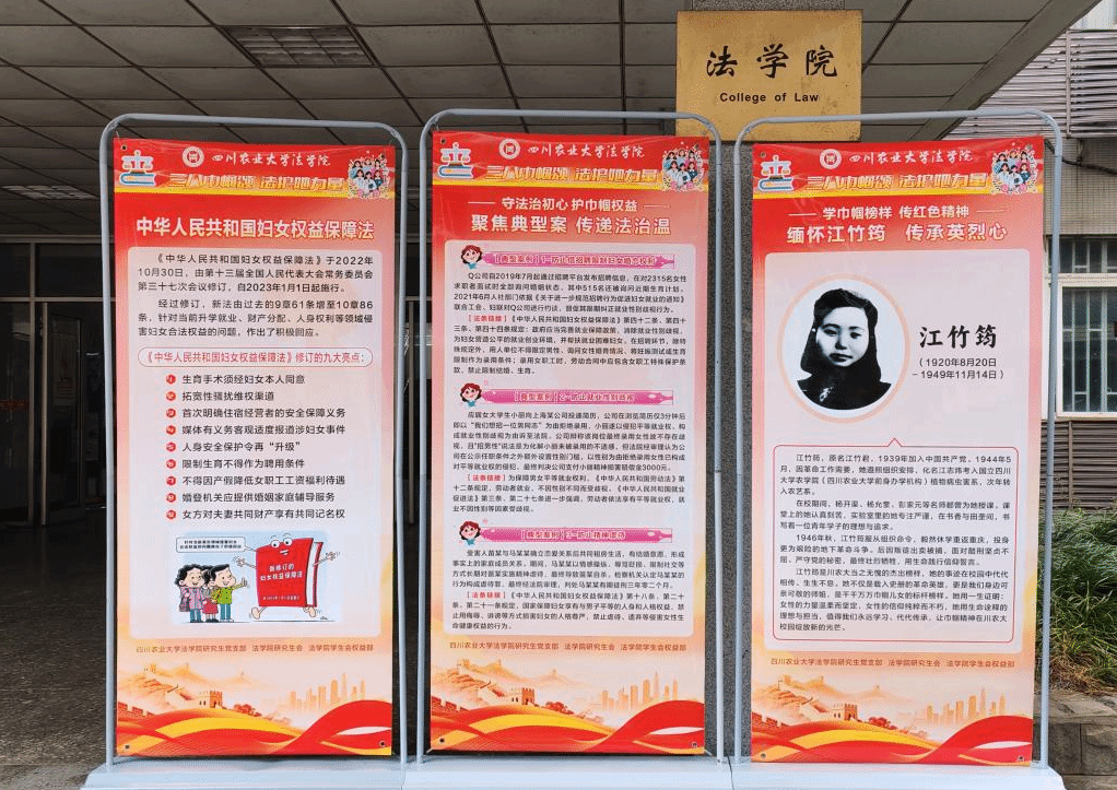 3月5日-3月8日,学院研究生党支部、研究生会联合开展“三八巾帼颂,法护她力量”主题活动,以线上线下相结合的形式开展女性权益保护宣传。活动通过法条解读、案例分享等向师生普及《中华人民共和国妇女权益保障法》的核心内容,引导大家增强法治意识,共同守护女性合法权益。同时,还通过重温优秀校友江竹筠的事迹,带领师生缅怀革命先烈、传承红色精神,学习巾帼榜样的忠诚与担当,凝聚奋进力量。