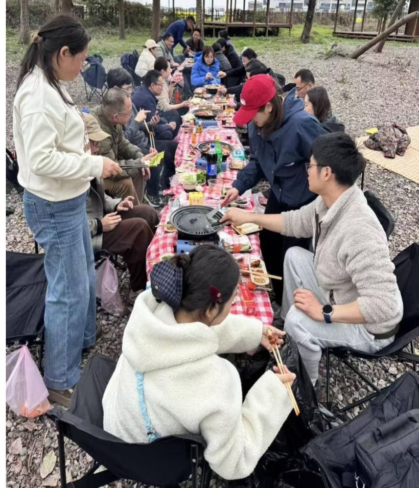中午时分,活动迎来最热闹的环节——露营烧烤。学院工会在园区指定区域精心布置了烧烤点位,食材丰富、炭火充足、调料齐全。大家分工协作,有的负责生火添炭,有的翻烤美味,有的忙着摆盘添菜,炊烟袅袅间,香气四溢,笑语不断。平日里严谨治学的老师们,此刻化身为“烧烤大师”,在烟火气中拉近了距离,在协作中增进了默契。